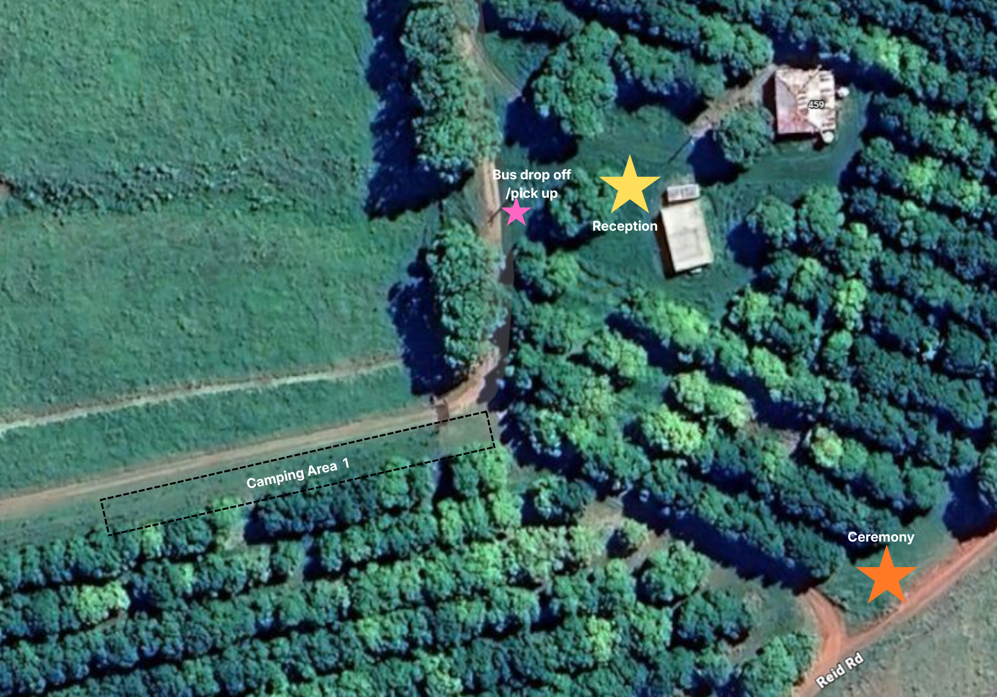 If you are camping on our property, please ensure you are self-sufficient (we rely on rainwater tanks). However, there will be portaloos available at the Reception area. Please inform us if you are staying and a rough idea of when you will be arriving. Anyone arriving prior to Saturday 30 May camping can camp in ‘Camping Area 1’ (See below pic 2). Anyone arriving on Saturday 30 May camping will be in ‘Camping Area 2’ (See below pic 1). And as per the parking area it is a 400m walk down our driveway from the Camping Area 2 to the Reception Area.